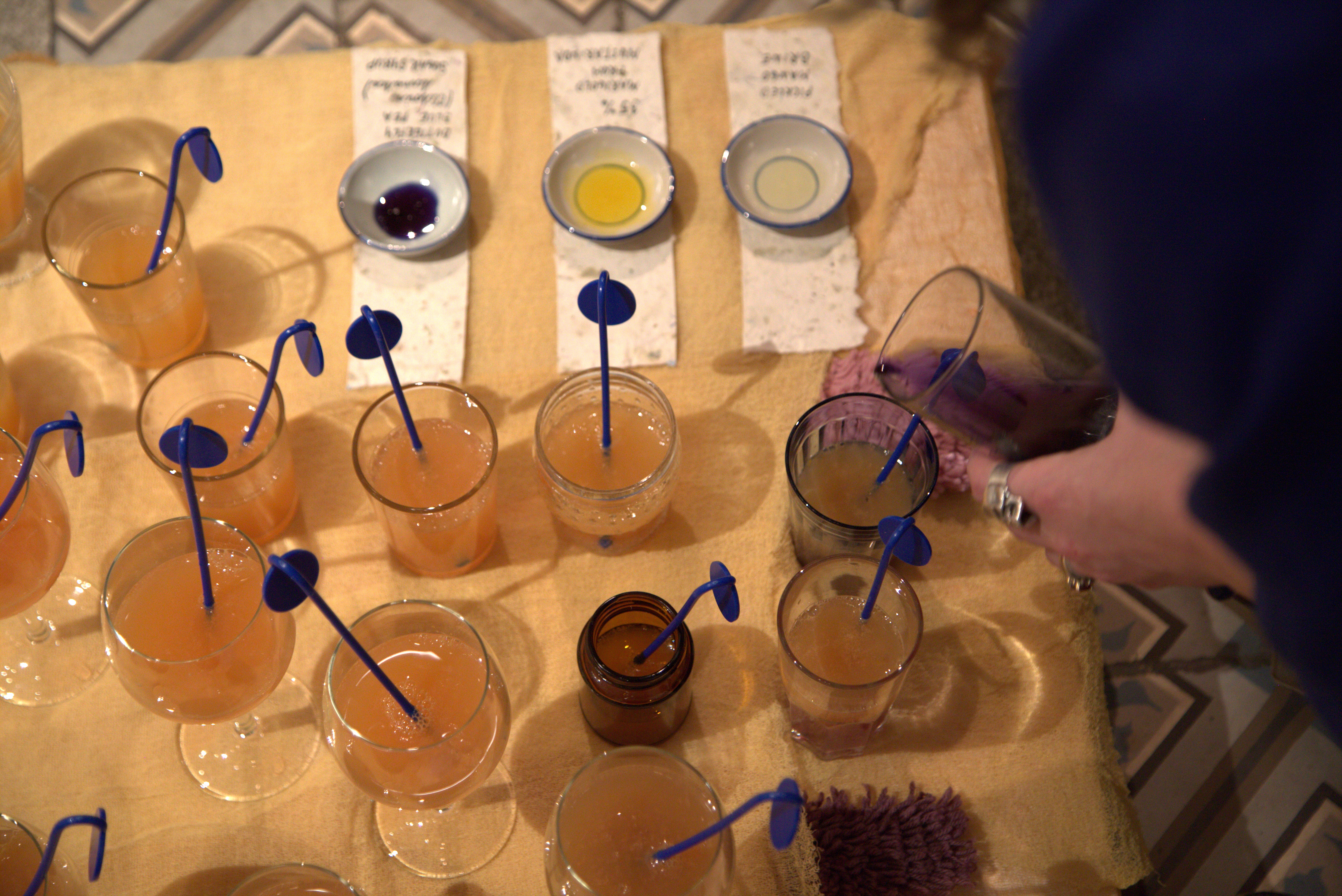 When making a selection of weather notes to include in this exhibition, the connecting points became quite clear. What is important are moments of foraging and preserving; being and working with weather; getting excited; and melding my kitchen with a laboratory. I sometimes wait months and years for how things will turn out, biding time by engaging with the many skilled people around me through walks and magic; listening and learning; experimenting; dancing around jars, vessels, bowls, steaming pans, and a shared cup of something; sniffing flavours that stimulate visual and haptic sensations. All of this—and the experience of wet socks—is implemented in my work. And in this moment, my work is also about raising a potion-filled glass to all those times we spent together, or sipping a colourful broth and admiring its shade while engaging in small talk.