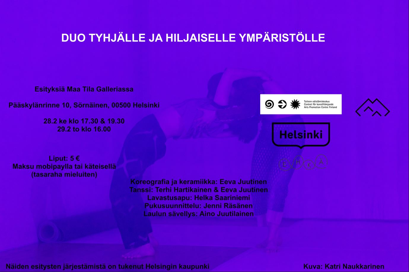 Performances for Duo for empty and silent environment in Maa Tila gallery on 28.2 at 17.30 & 19.30, 29.2 at 16.00! Tickets 5e, mobile pay or cash.