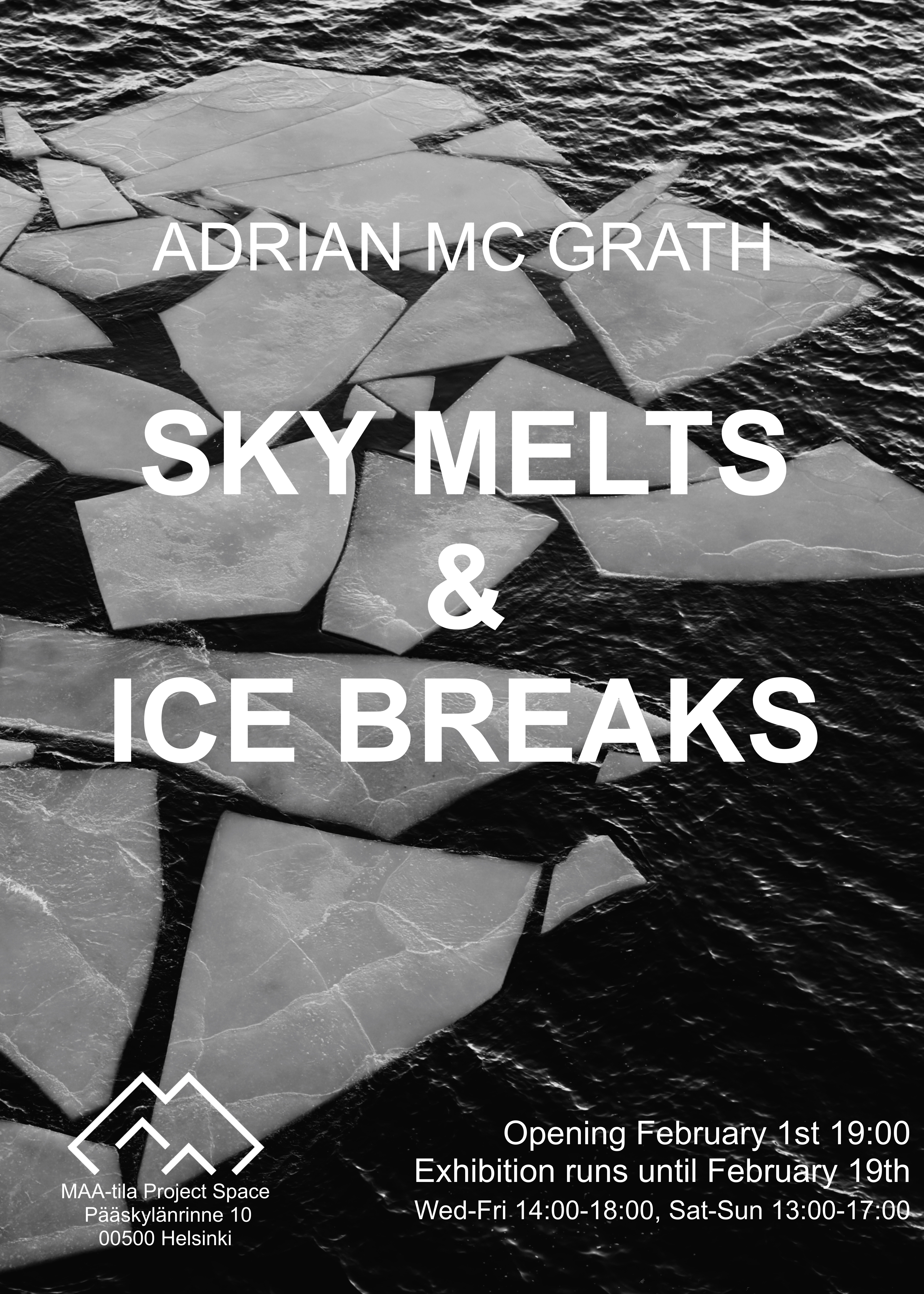 In his exhibition SKY MELTS & ICE BREAKS, at Maa-Tila, Adrian Mc Grath presents new works which mark a notable transition in his practice away from merely identifying hazards, onto suggesting a possibility of healing from them. This healing could be seen as a personal resurrection, or renewal, but for this to occur some form of death must be experienced, and it is through these current works in SKY MELTS & ICE BREAKS, that Mc Grath signals an ultimate end, an end in which one sheds all parts of the present self, even hope, only to somehow rise and rebuild. A necessary end, but one within a process of going on, contradictory of course, but sincere belief in the descent is necessary for one to discard all of now. Mc Grath allows the drastic seasonal changes of the Finnish environment, to inform his approach to this exhibition, in order to strike a most common chord for all who have known it’s harsh winters, and the consequentially more delightful springs.
